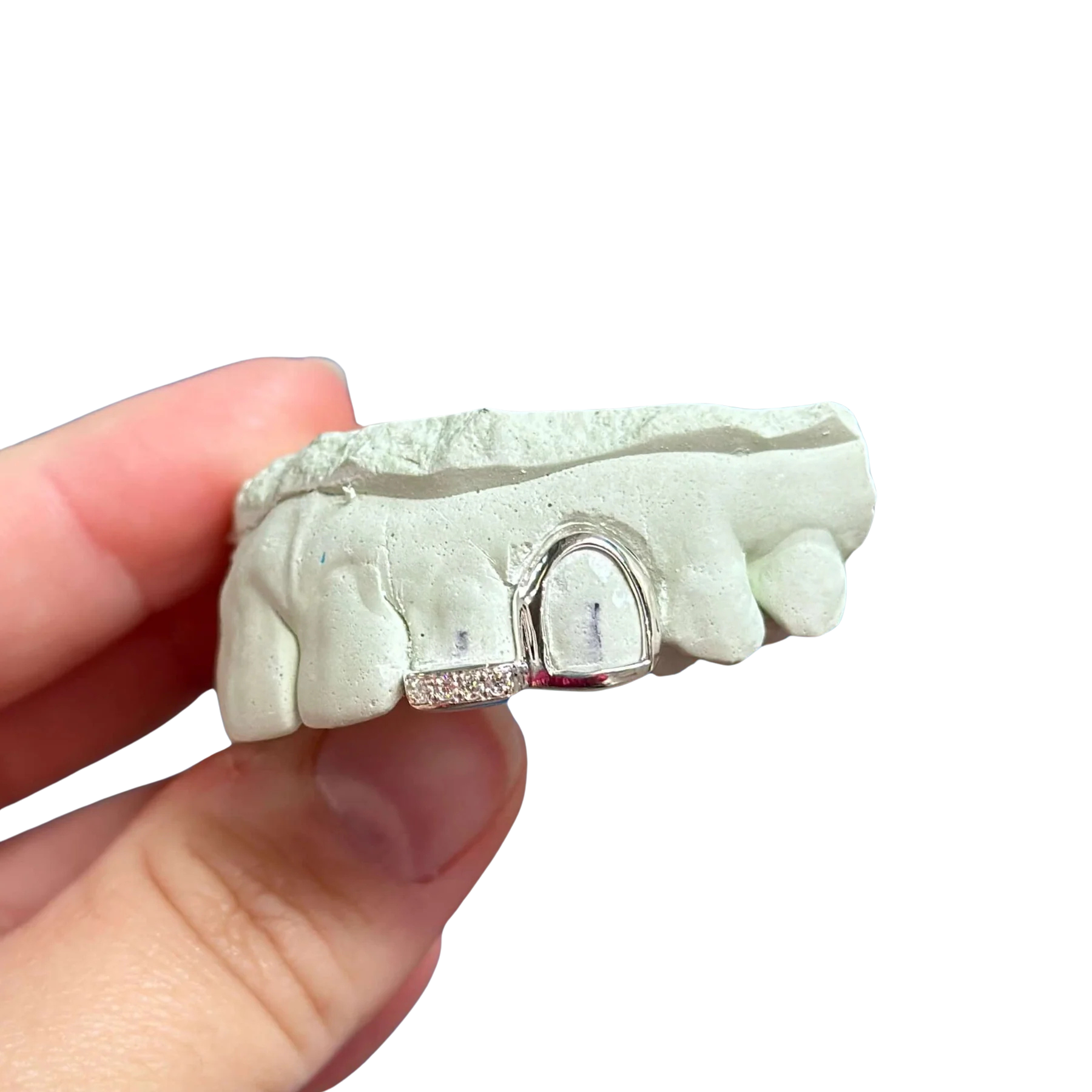 Canine & Iced Front Bar along Incisor. You can choose between a Solid Face Canine, Window or Shape Cut Out (Heart, Star, ect) on the Canine. You can determine this at the time of your in person consultation.