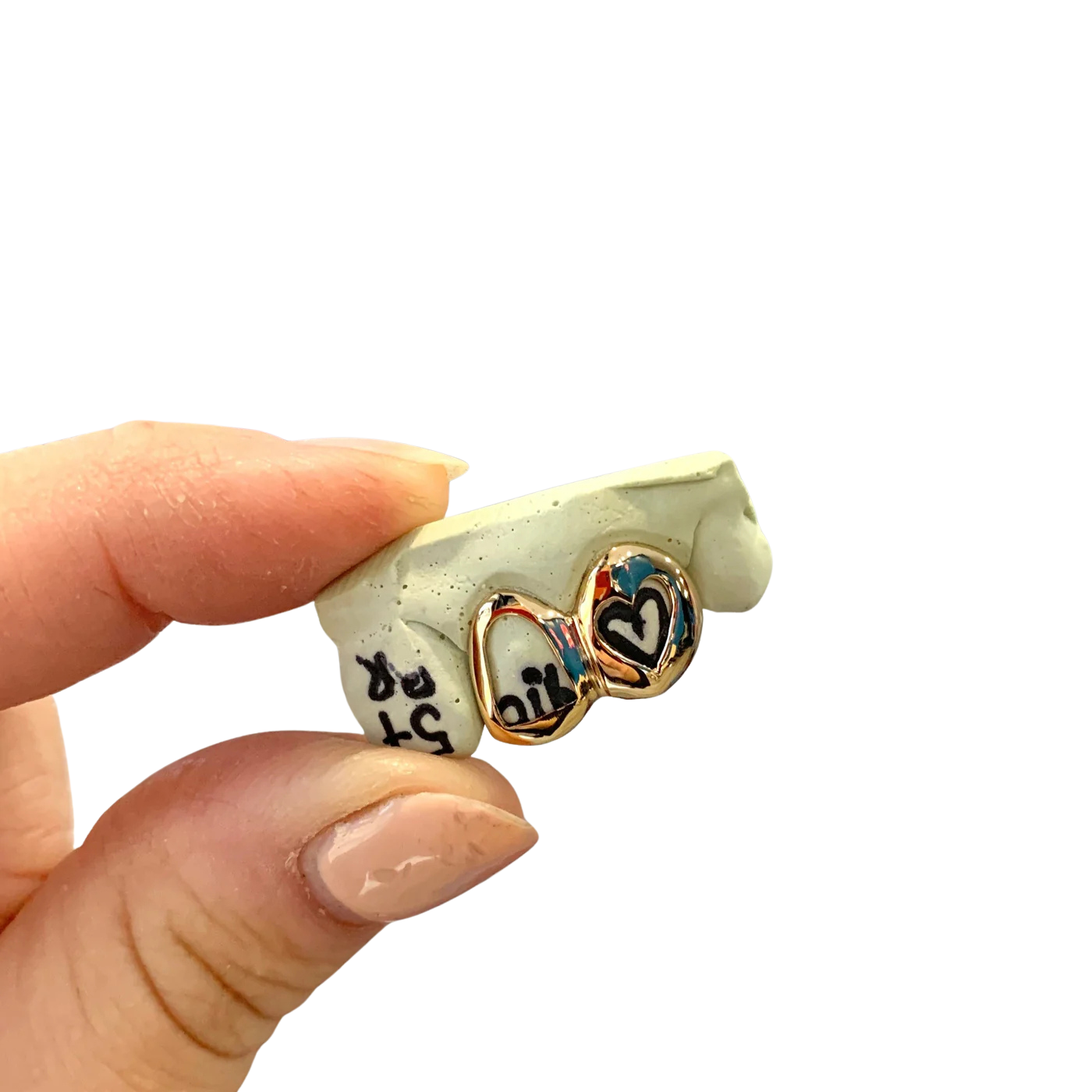 2 Piece Set - Window & Shape Cut Out. These can be on any 2 side by side teeth and cut out can be of any shape. This can be specified during your in person appointment.